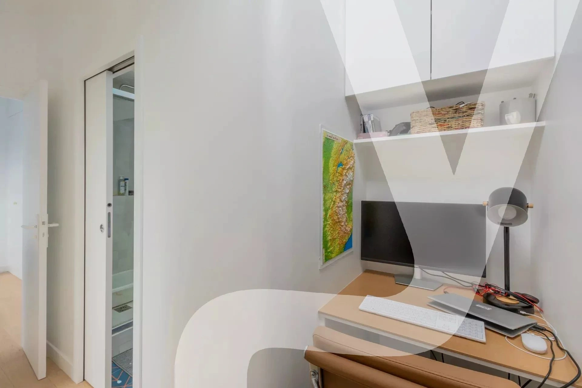 L'appartement dispose également de deux chambres avec dressing intégré, d'un coin bureau fonctionnel, d'une jolie salle d'eau et d'un WC séparé.