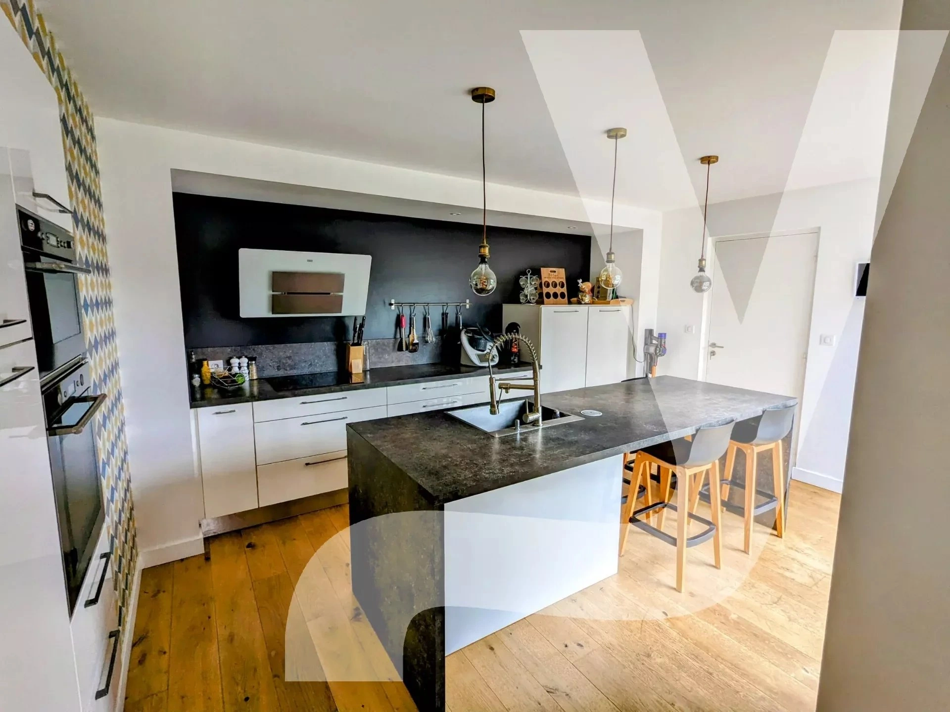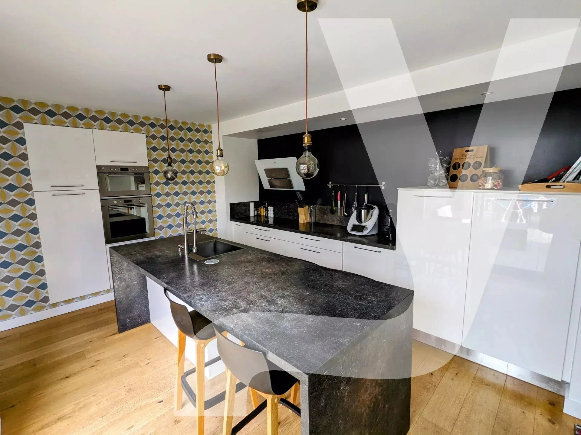 Cuisine ouverte moderne : Entièrement aménagée et équipée (four, micro-ondes, plaques à induction, hotte et lave-vaisselle), la cuisine est conçue pour allier praticité et style avec accès direct au garage (espace buanderie) de 22 m².