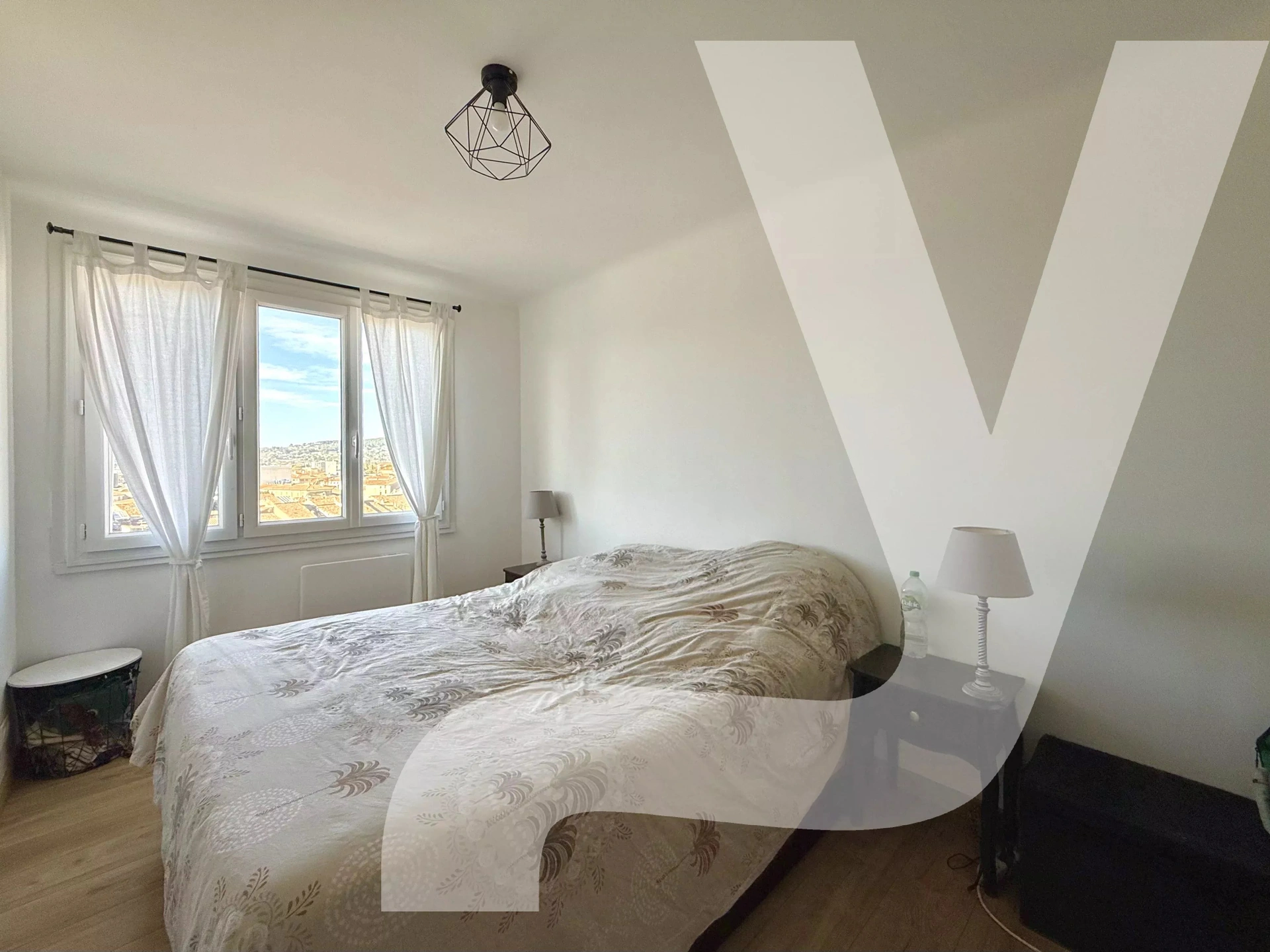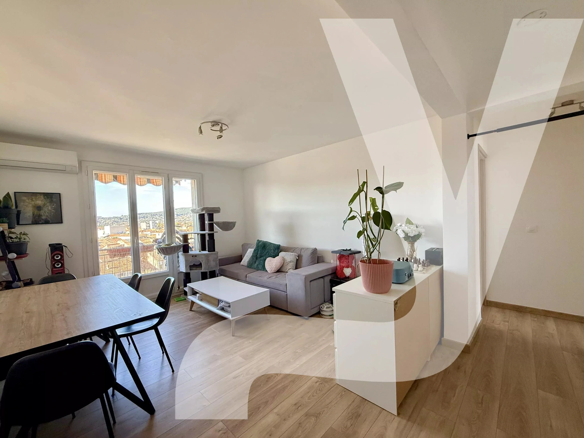 Dès l’entrée, vous découvrirez une pièce de vie lumineuse et aérée, ouvrant sur un agréable balcon offrant une vue panoramique sur la ville et ses collines. Une cuisine aménagée et équipée complète cet espace convivial. L’espace nuit se compose de deux chambres, d’une salle d’eau ainsi que de toilettes indépendantes.