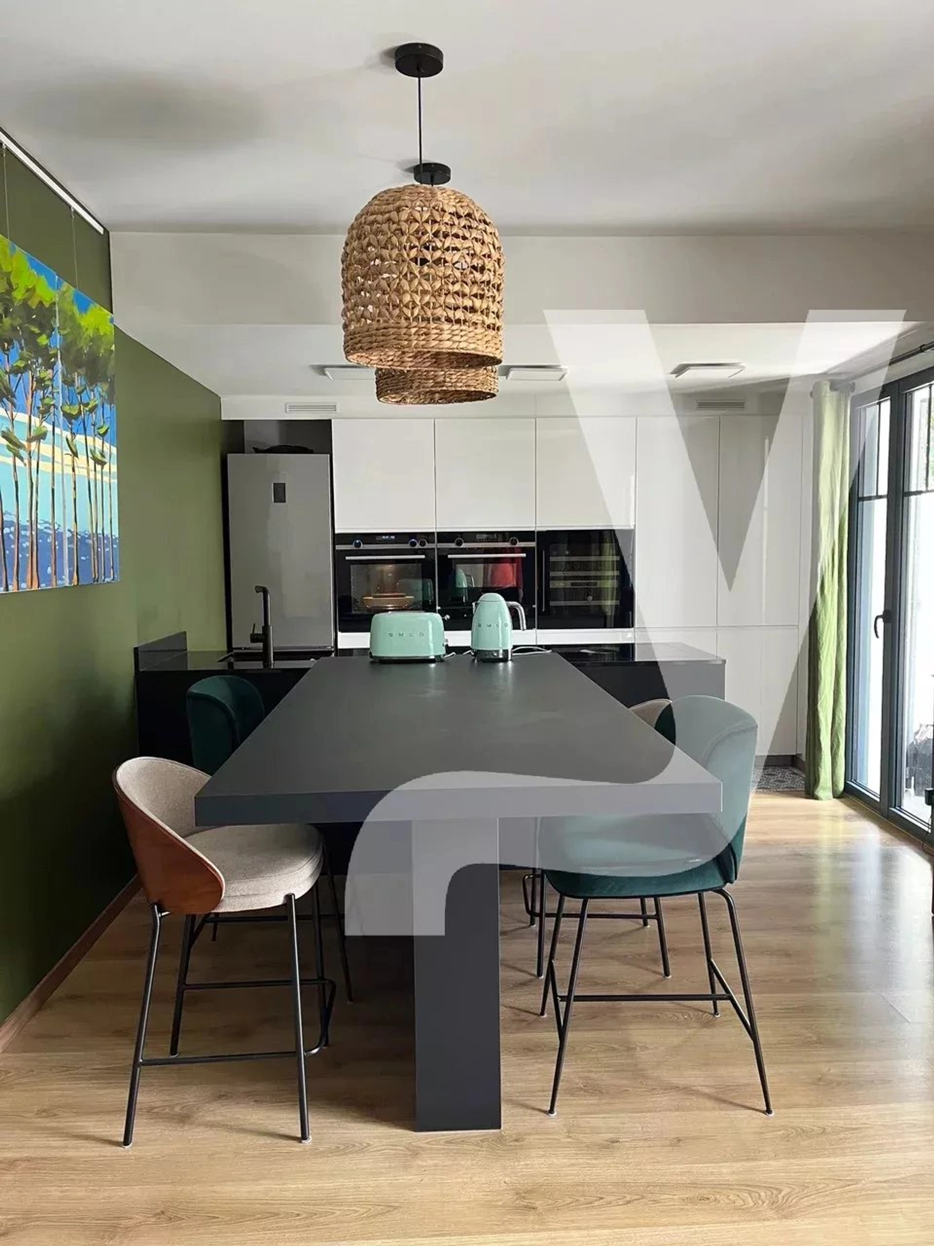 Au rez-de-jardin, un vaste salon-séjour baigné de lumière s’ouvre sur une cuisine hautement équipée.
