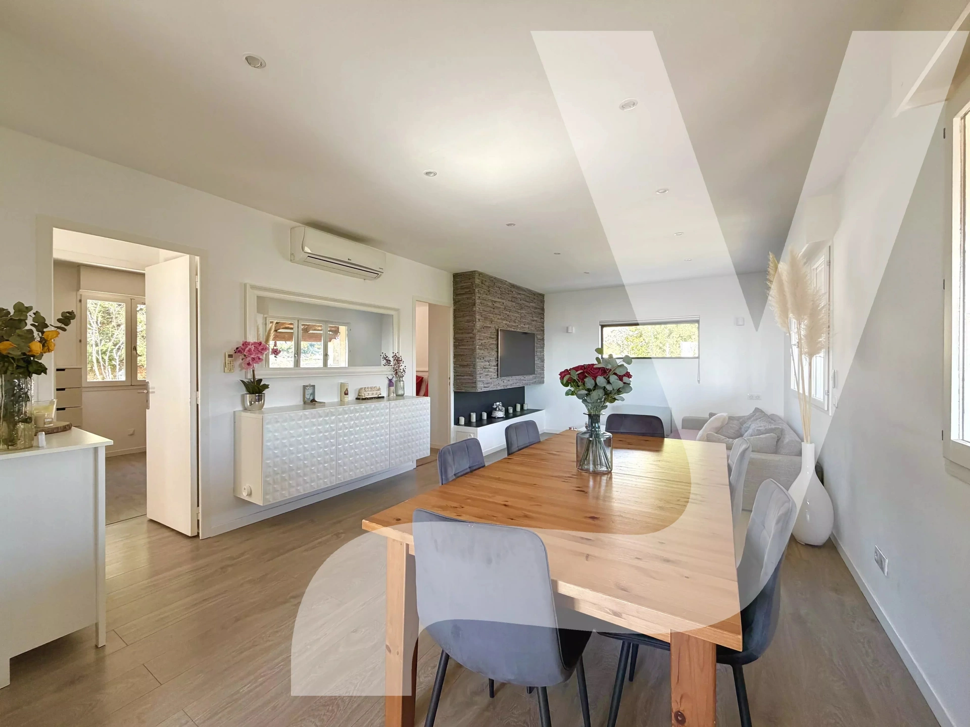 La maison bénéficie de prestations techniques appréciables, telles que la fibre optique, des caméras extérieures, un éclairage LED sur l’ensemble du terrain, un système d’arrosage automatique, une climatisation réversible, des volets roulants électriques Somfy ainsi que du double vitrage bois. Exposition Sud-Est.