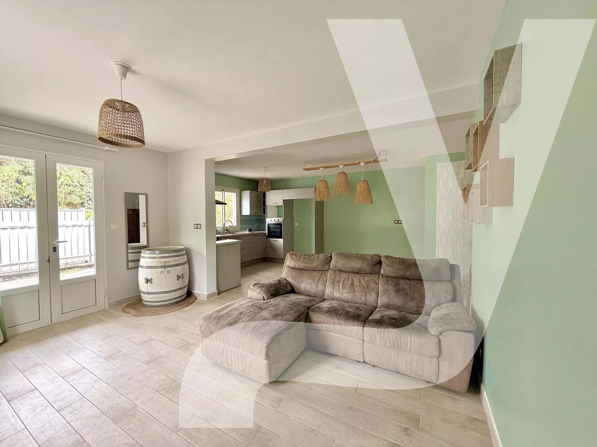 La cuisine moderne et lumineuse, ouverte sur le séjour, favorise les moments conviviaux en famille ou entre amis.