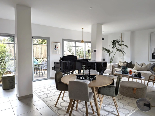 À l’extérieur, un jardin soigneusement paysagé invite à la détente. Vous pourrez savourer des moments privilégiés au bord de la piscine sécurisée, parfaitement intégrée à l’espace extérieur.
