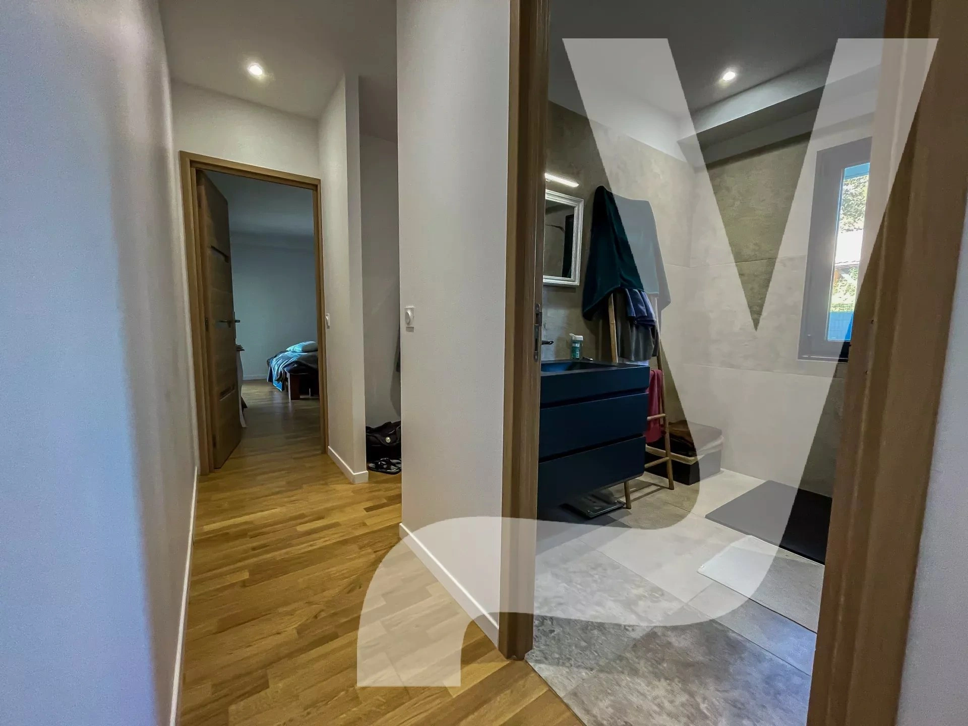 À l’étage, un grand palier dessert deux superbes chambres et une salle de bain élégante équipée d’une douche, d’une baignoire et de WC.