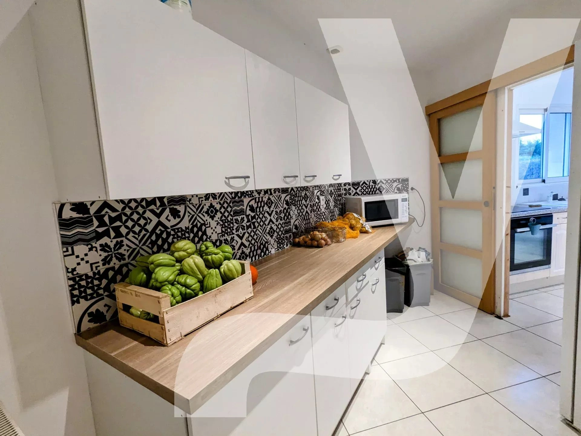 La cuisine communique avec le cellier de 6 m² entièrement aménagé, idéal pour exposer tout votre petit électroménager.